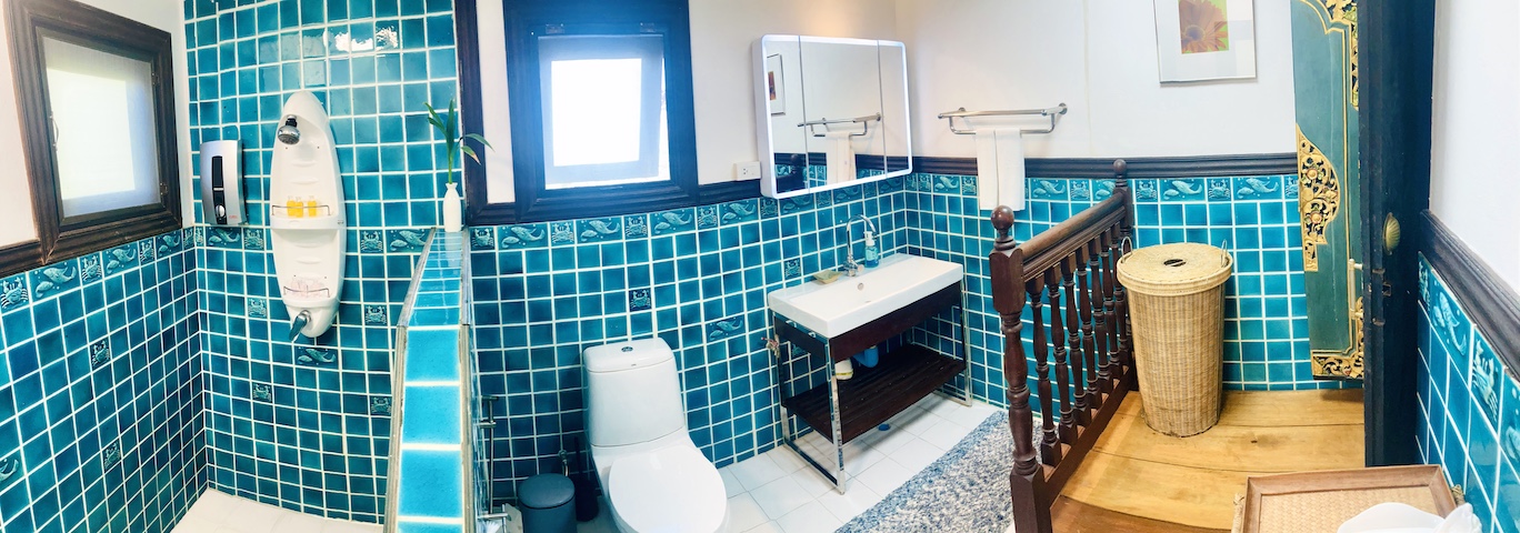 The upper 1st floor hosts a 60 sq.m bed and living room with an en-suite bathroom. The villa has two king size beds and a large seating area. From the large 75 sq.m terrace including a Thai Sala guests can enjoy a sumptuous view of the lush tropical garden and lotus pond.